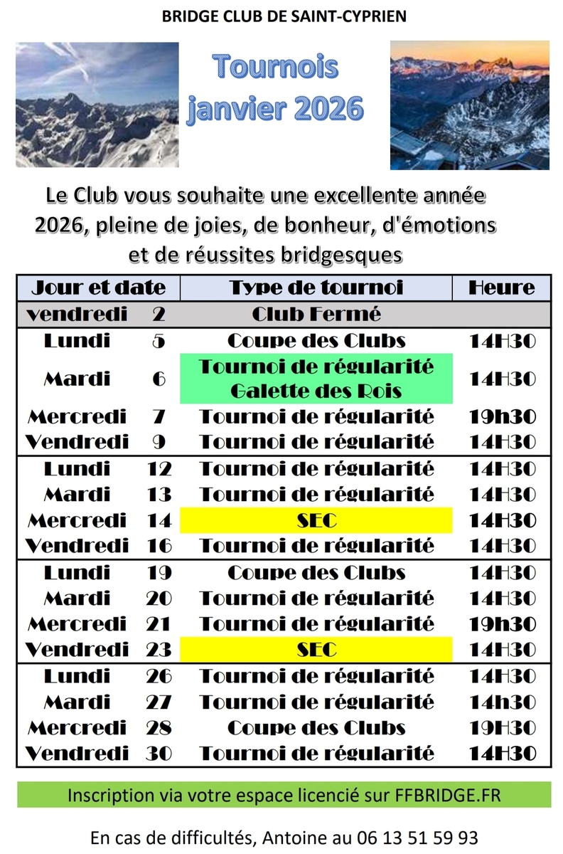 Galette des Rois le mardi 6 après le tournoi de régularité, ouvert à tous.