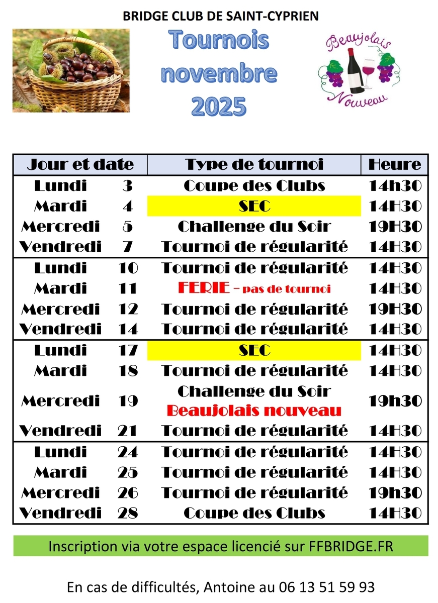 Mardi 4 novembre : SEC ouvert à tous; Mardi 11 novembre : Férié- le club sera fermé
