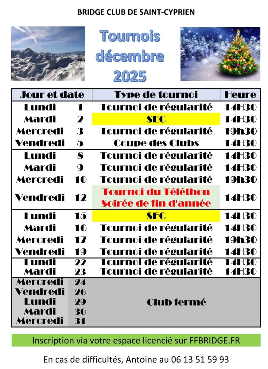 SEC le mardi 2 et lundi 15 Tournoi du Telethon le vendredi 12 suivi de la soirée de fin d’année